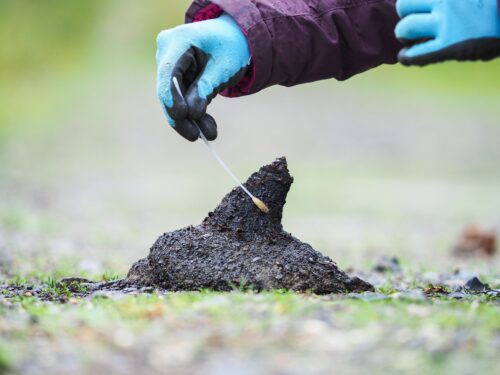 ヒグマ目撃通報を受けて現場に急行しても、既にヒグマが居なくなっている場合が多々あります。そのような場合は周辺をよく観察し、移動経路はどこか、どんな食べ物があるのか、人為的な誘引物はないか、足跡・糞・体毛等の個体識別に役立つものは残されていないか探し、記録します。足跡は計測し、新鮮な糞や体毛はDNA分析に供するため回収します。