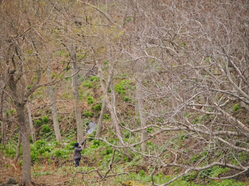 私たちが「ヒグマにいて欲しくない」と考える場所、たとえば道路沿いや遊歩道の中、住宅裏の斜面などにヒグマが現われた場合は、原則として(個体識別用画像の撮影後に)追い払いを実施し、ヒグマにその場所から移動してもらっています。