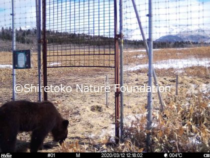 撮影日時は3月12日です。年によって前後しますが、知床でヒグマが活動を開始するのは例年3~4月です。ヒグマの姿を初確認したのは、2015年は3月12日、2016年は3月5日、2017年は3月17日、2018年は4月2日、2019年は3月10日でした。今年の初ヒグマ情報は、”平年並み”と言えそうです。
