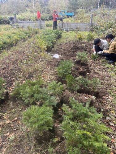10月9日、植樹祭に向けて、スコップを使い計130本のトドマツ苗の掘り取りを行いました。