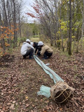 シカの被食から木を守るための樹皮保護ネットを巻いていただき、植樹地に苗木を運び込みます。