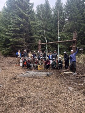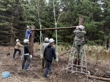 針葉樹主体の暗い林床の森に造成したギャップ(林冠が途切れて日光が供給される空間 )に、広葉樹の苗を植樹する作業です。