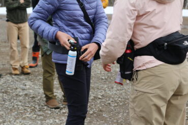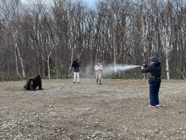 その後、昨年度までの参加者アンケートにおいて「クマスプレーの試射体験をしたい」とのご意見をいただいていたことから、今回初めて「クマスプレーの試射」をプログラムに追加しました。